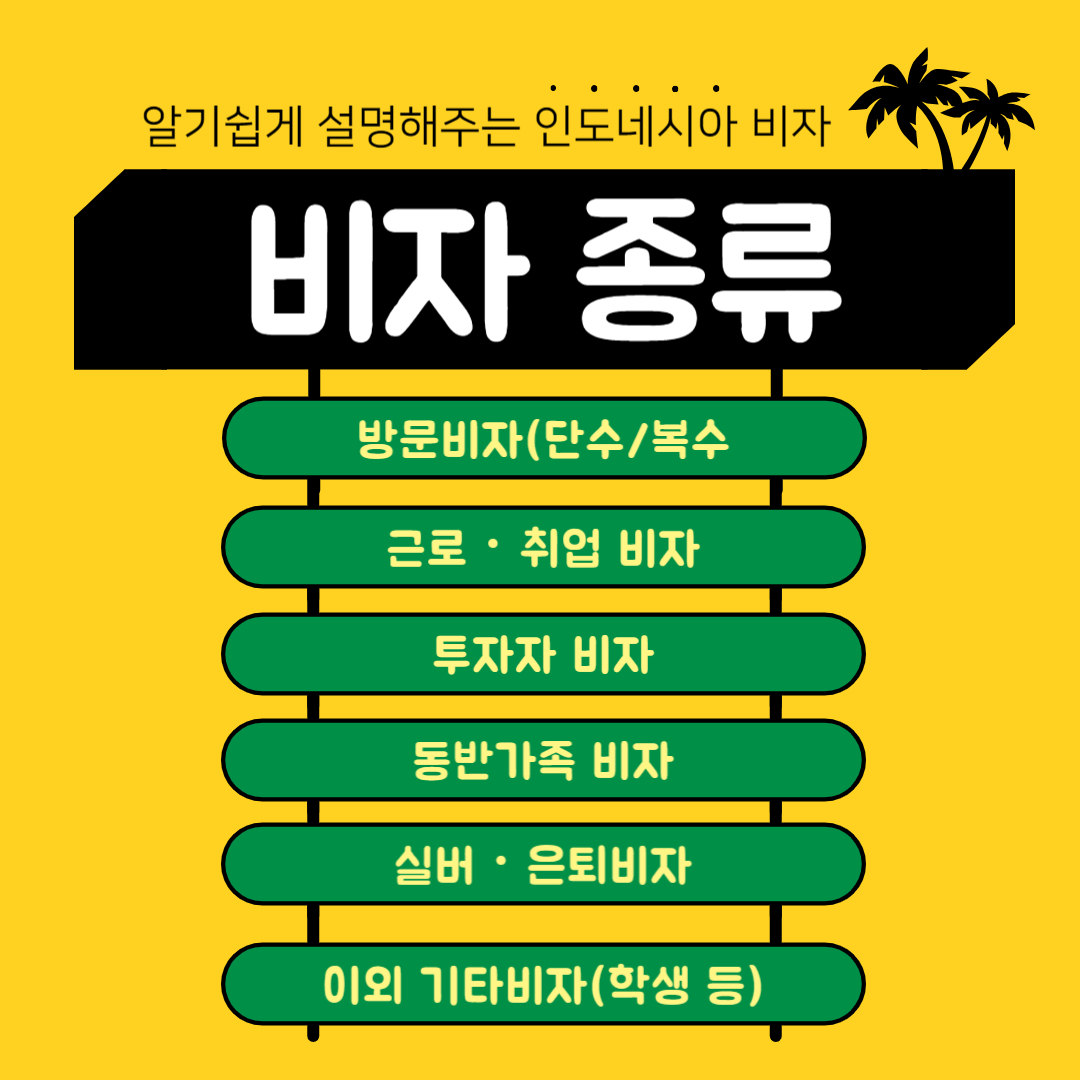 인도네시아는 체류 목적에 따라 다양한 비자를 제공하며, 각 비자의 요건과 혜택이 다릅니다. 개인의 필요에 맞는 비자를 선택하고, 준비 서류를 철저히 확인해 신청하세요.
