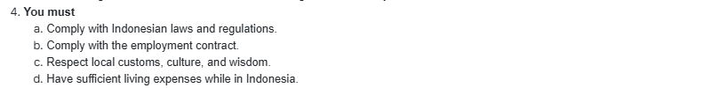• 인도네시아의 법률을 준수하지 않을 경우 벌금 납부, 추방 및/또는 기타 법적 처벌