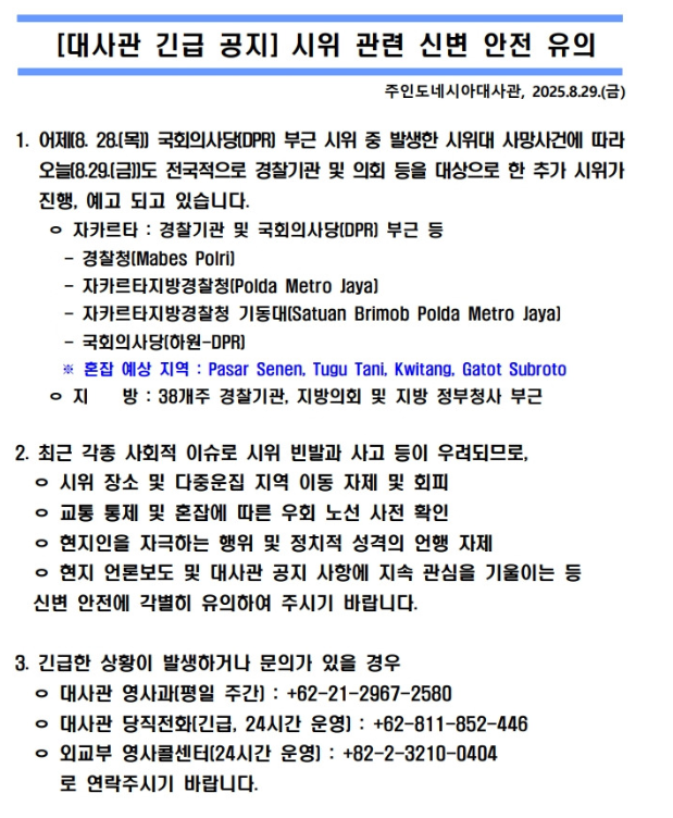 현재 자카르타 내 불안정한 정세와 전국적으로 확산되고 있는 시위 사태와 관련하여, 각국 주재 외교 공관들은 자국민의 안전을 최우선으로 고려하여 긴급 공지와 경보를 발령하고 있으며, 시위 지역 및 혼잡 구역을 피하고 외출 시 주의하며, 실시간 현지 정보를 확인할 것을 포함한 구체적인 안전 지침을 제공하고 있습니다. 또한 주인도네시아 한국 대사관 역시 이러한 긴급 공지를 전달한 상태입니다.